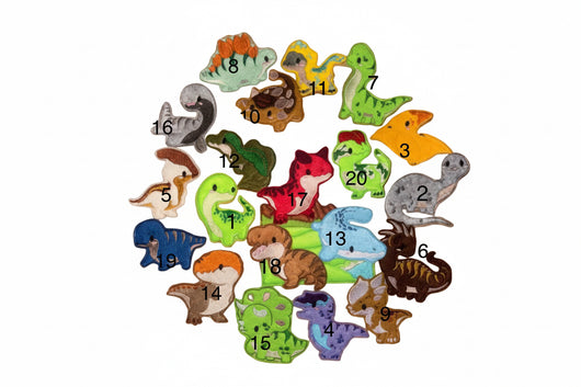 Dinosaur puppet set consists of 20 different dinosaur puppets and a bag to keep them together.