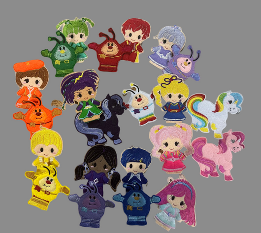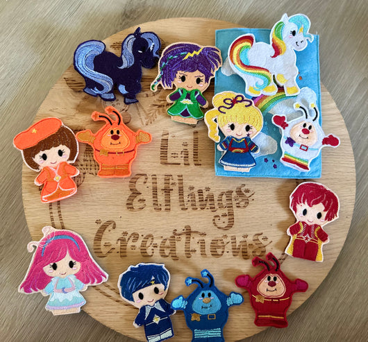 Acrylic finger puppet set consisting of 22 puppets and a bag to store them in.